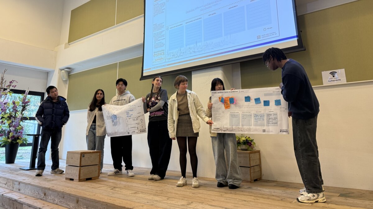 Na een korte inleiding over de ruimtevaart testten de scholieren hun kennis met een quiz. Op de vraag “Wie zijn de belangrijkste spelers in het ruimtevaartdomein?” kwamen al snel bekende namen voorbij: NASA, ESA en natuurlijk André Kuipers. Ook bij de vraag waarvoor remote sensing wordt gebruikt – van klimaatonderzoek tot communicatie en economie – bleek hoe breed het onderwerp leeft bij de deelnemers. Daarna gingen de deelnemers aan de slag met een praktijkopdracht. In kleine groepjes werkten zij met behulp van een speciaal canvas toe naar een eigen idee of oplossing waarbij satellietdata centraal stond.